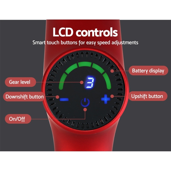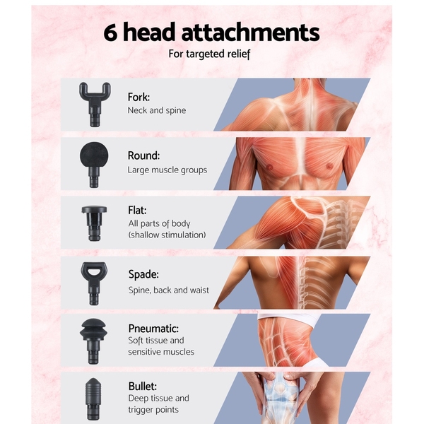 Chronic muscle pains? Hardcore gym junkie? Office job with long working hours? Recovering from an accident? Whatever your situation, our Percussion Massage Gun provides customised percussive therapy in the comfort of your own home, without the need to visit luxury spas or physiotherapists. The powerful 12V brushless high-torque motor with closed-loop control operates quietly and provides rapid bursts of pressure penetrating 12mm deep into your muscle tissues at up to 4000 percussions per minute. The massage gun is powered by a rechargeable lithium battery that lasts up to 8 hours so that you can forget to recharge once in a while and the non-slip rubber handle provides a comfortable grip to reduce hand fatigue. Percussion speed can be easily adjusted using the intuitive LCD display with smart touch controls and there are 10 speed levels to suit various purposes from simply waking up your muscles to decreasing lactic acid and accelerating muscle recovery after exercising, or even intense professional-level massages. And with the six interchangeable head attachments for targeted relief (round, fork, bullet, flat, Pneumatic and Spade heads), you are ensured of a fully customised massage.