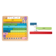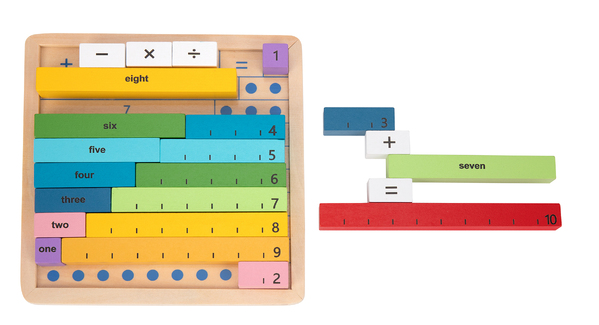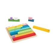 These colourful wooden rods are mathematics learning aids for students that provide an interactive, hands-on way to explore mathematics and learn mathematical concepts, such as aritmatics, working with fractions and finding divisors. These coloured rods are great learning tools and are sectioned into ones on selected rods. This set also comes with mathematics symbols for easy to reference equations. This set of rods is a great visual tool to help any child improve on their basic maths skills. This set is for beginners who already have a concept of numbers and basic addition and subtraction. Once you've finished your maths sums for the day, these coloured rods neatly pack up into a wooden tray to keep neat and contained. Made from beautifully finished solid timber and painted in non-toxic paint.