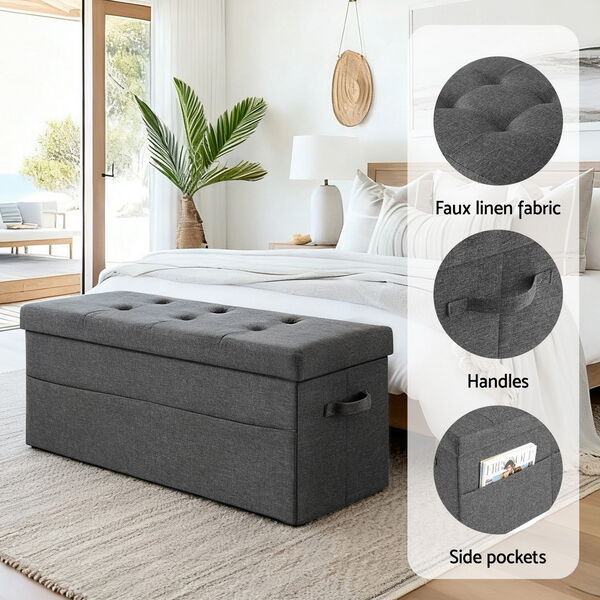 Stylish and functional, footstool makes a perfect addition to any living space. Not just the living room, you can style it in the bedroom, dressing room, kid's room or foyer. This versatile piece of furniture not only offers a comfortable place to rest your feet but also as a seat. It provides a clever storage solution to declutter your space and keep your belongings, such as throws, blankets, couch covers, and socks, organised and out of sight. Crafted with linen fabric, the footstool adds a touch of luxury to your space. It's also lightweight and easy to move around, allowing you to adapt your space to suit your needs and preferences. When not in use, simply fold the lower part flat and conveniently store it under your bed or on a shelf in your cupboard.