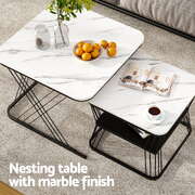 Upgrade your living space with the Nesting Coffee Table Set of 2 featuring a chic marble-effect tabletop and durable metal frame. This nesting tables are perfect for modern homes, offering space-saving functionality with a stylish flair. The rounded edges enhance safety, while the smooth surface ensures easy cleaning. Whether you need a coffee table for your living room or a side table for your apartment, this versatile tables deliver on both style and practicality.