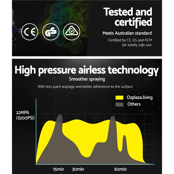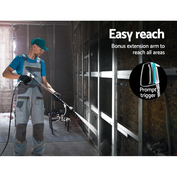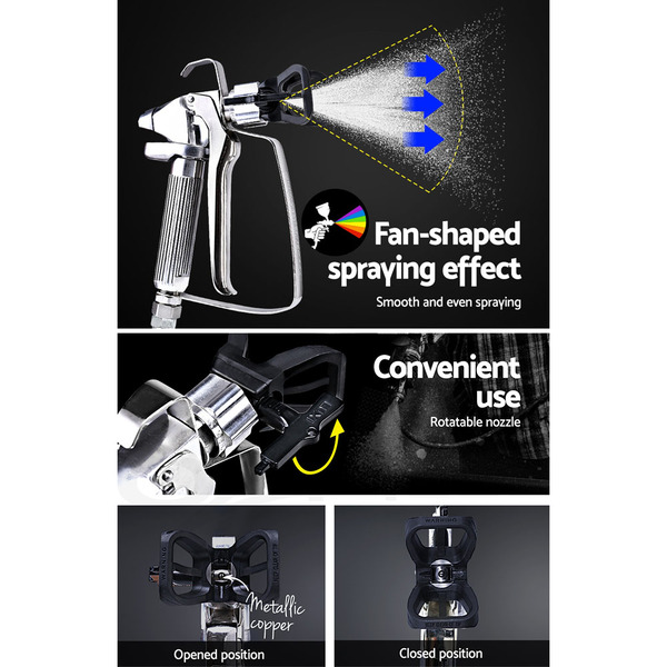 Discover better painting with the Giantz Airless Paint Sprayer. The 740W paint sprayer actually pressurizes the paint to deliver more even and accurate spraying with less paint wastage. The ultimate result is a nice and thick paint job with better paint adhesion too. Compatible with all paint types, the compact and powerful airless sprayer features an all-metal spray gun and a host of professional accessories. It comes with a 7.5m high-pressure hose with a bonus nozzle extension arm to help you paint difficult-to-reach areas. Among its useful features are a paint pressure regulator, quality mesh paint filter and a pressure gauge to enable you to create flawless painting. Use it for vehicle painting, interior and exterior painting or even artistic masterpieces. Not least, the paint sprayer comes with spare seal rings, filters and a cleaning kit.
