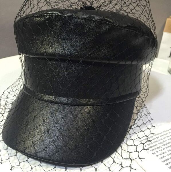 Octagonal Cap Women Solid Black PU Lace Veil Newsboy Beret Hat Spring Summer
