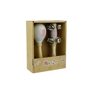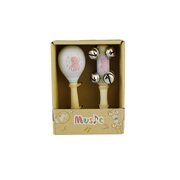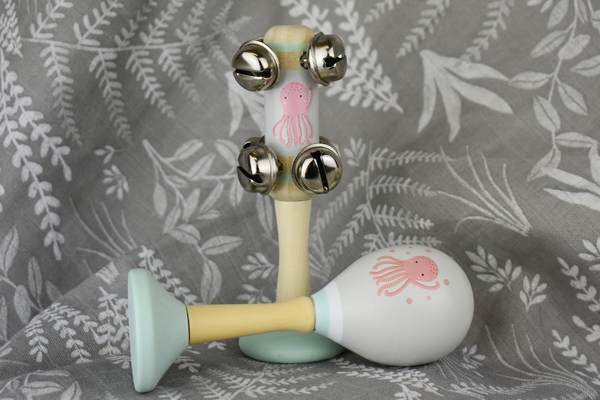 A beautifully finished wooden bell stick and maraca 2 piece musical set featuring an Octopus design from Calm & Breezy by Kaper Kidz. These musical instruments are perfect for babies and small children as they encourage developing hand-eye coordination as well as building gripping and arm muscles. As small children shake these toys, they play a gentle sound which is both soothing and encouraging. Each wooden 2 piece musical Set from Calm & Breezy by Kaper Kidz is made from timber and finished to the highest quality and painted in child safe, non toxic paint.