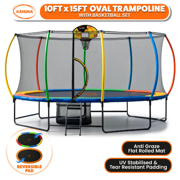 Bounce bigger, brighter and bolder with the Kahuna 10x15ft Oval Trampoline! Designed for fun and safety, it features a heavy-duty steel frame, UV-stabilised safety net and tear-resistant padding for long-lasting play. The standout feature is its reversible safety pad, which flips between a vibrant rainbow or bold orange to match your backyard vibe. Its high-tension springs and anti-graze mat deliver smooth, powerful bounce with every jump.