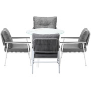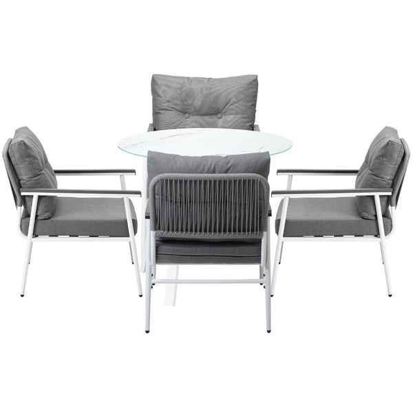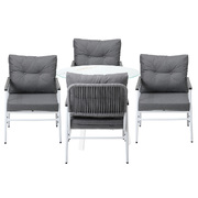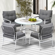 Living life to the fullest. Chilling out under the sun, moon and stars. Alfresco dining with friends, family or just with your precious me-time. Simply pursuing and enjoying life that is meant to be. And the Outdoor Dining Set is ready to be there at home with you. Stylish. Contemporary. Beautiful. For the dining table, a white ceramic tempered glass top with handy storage shelf beneath. And for the dining chairs, equally attractive pieces that go well with the table. The set has all the attributes of chic outdoor furniture that resonate with your discerning lifestyle. Have your lattes, your favourite brews and savour delectable cuisines and other gastronomical delights. Eat, drink and be merry! But how does the dining set stand up to the harsh and sometimes fickle Australian weather? No worries mate as it is all weather-resistant, chairs and table, with strength and durability for robust use. Not least, this dining setup also looks fabulous with any indoor eclectic styling ideas that you may have. Convinced that this delightful outdoor package is for you? Click on the Buy option and soon you will be feasting to your (and many others too) heart's content at the Outdoor Dining Set day and night, night and day, in every season.