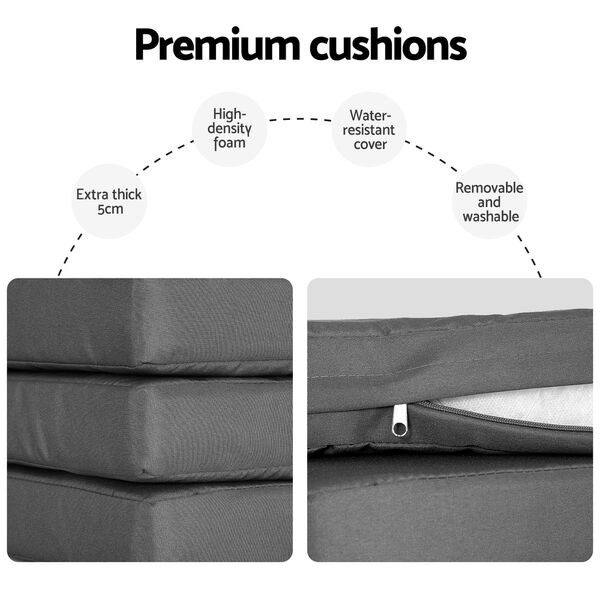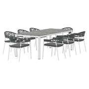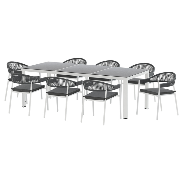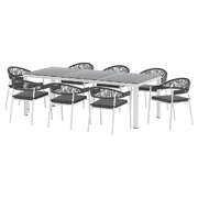 Experience the best the outdoors has to offer with this 9-piece Outdoor Setting. Featuring eight single chairs and a matching dining table, this set is perfect for sitting outside and watching the world go by in comfort and style. The set is made using powder-coated steel and meticulously hand-woven rope for rust and water resistance, while the removable outdoor cushions feature water-resistant fabric and thick 5cm high-density foam for comfort. The chairs have a slanted backrest and handrails to keep guests comfortable for hours on end. It is easy to assemble and features non-slip feet to keep everything in its place. The dining table features a stylish tempered glass tabletop that is gorgeous to look at, easy to maintain and generous enough to hold all of your favourite drinks, reading materials or outdoor games. Maintenance is as easy as wiping down the furniture with a damp cloth. So what are you waiting for? Make the most out of the beautiful weather with a 9-piece Outdoor Dining Setting.