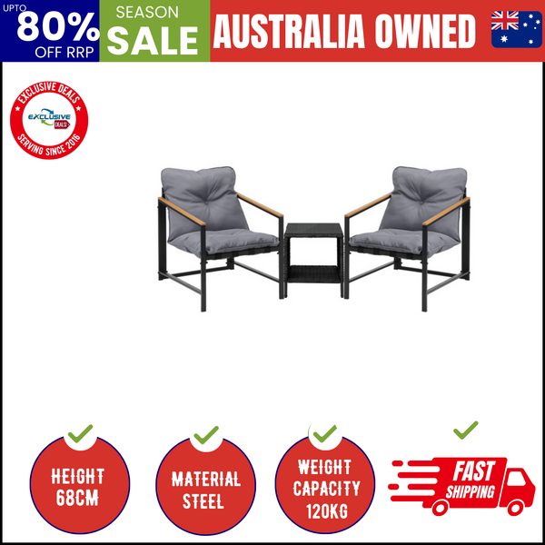 But how does the lounge set stand up to the harsh and sometimes fickle Australian weather? No worries mate as this delight set is all weather-resistant with strength and durability for robust use. Not least, this threesome setup also looks fabulous with any indoor eclectic styling ideas that you may have. Convinced that this delightful outdoor package is for you? Click on the Buy option and soon youll be having the best of company with the Outdoor Patio 3-pc Lounge Set in attendance.