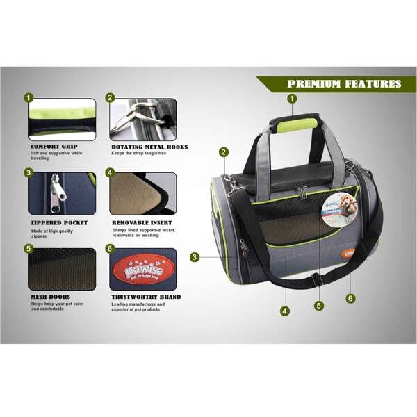 Carry your pet in comfort and style with this Pawise Pet Travel Bag. Ergonomically designed with multiple zippered mesh windows for optimum breathability and visibility, contains a comfortable reversible fleece covered base insert and sturdy and adjustable straps.