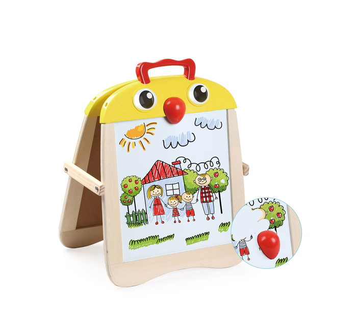 A well designed blackboard/whiteboard that looks like a chicken! Made from the finest high quality wood. Whiteboard are magnetic so it can be double up as a magnetic whiteboard. Come complete with whiteboard marker, chalk and a duster. Large in size, it's highly mobile and it sports a trendy red carry handle. Will help entertain your customers' children for hours!