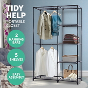Need more closet space? Want a fast and easy option? Then look no further than our Portable Closet. Made of a sturdy Powder-coated metal, the closet is lightweight and yet strong and durable. It comprises two hanging bars and a 5-tier storage shelf that provide you with ample space to hang your clothes and store a host of home essentials. Better still, the lower hanging bar can also be removed to accommodate long dresses or large overcoats. And you can also get creative and hang more than just clothes. Such as a hanging organizer for a stylish storage mix. The closet is easy to put together and it also comes with two bonus wall tie holder sets for extra stability. Not least, it can used in any space or any room to store a variety of items.