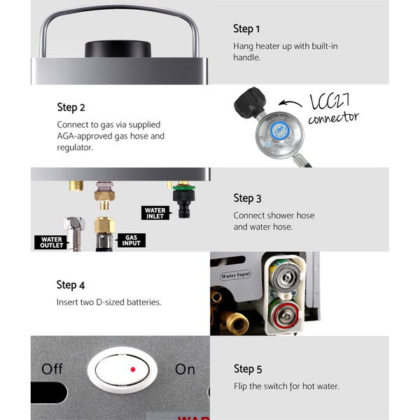 Designed for outdoor use and easy to install, the Gas Water Heater can heat up to 360L of water per hour which is ample enough to have a shower, wash the dishes or even clean the dog. The water temperature is easily adjustable and shown on the bright LED display. Better still, the in-built processor stops the water temperature from exceeding 50℃, thereby preventing accidental scalding. Not least, the variable flow shower head has an automatic on/off trigger that ignites and switches off the burner.