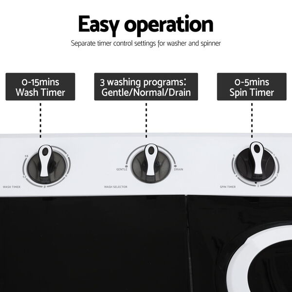 Unleash the power of convenience with our Portable Twin Tub Washing Machine. Designed for efficiency and ease of use, it features a generous 7kg washing capacity and 4kg spinning capacity—perfect for handling daily laundry in a single go. Its twin tub design allows you to wash and spin simultaneously, saving you valuable time and effort. With its powerful dual motor system, this machine boasts 380W washing power and 160W spinning power. The intuitive three-knob control panel with Gentle/Normal/Drain modes ensures simple operation for everyone, even the elderly. Separate timers for washing (up to 15 minutes) and spinning (up to 5 minutes) give you complete control over your laundry cycle. Its compact, lightweight, and no-installation design makes it ideal for small spaces, offering a convenient, space-saving solution to your laundry needs. No installation is required—just plug it in and get started.