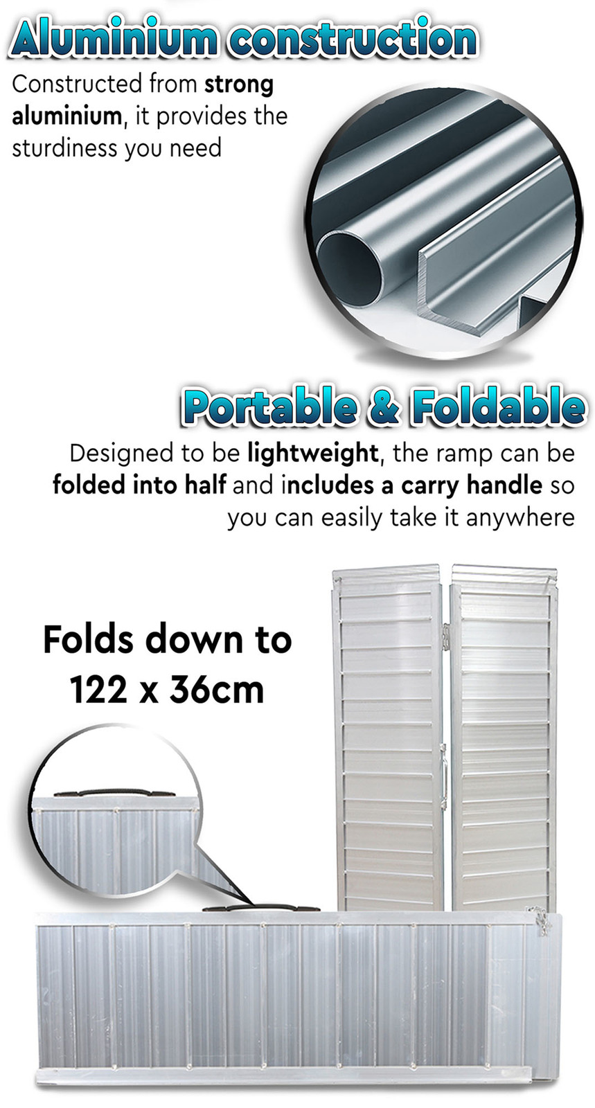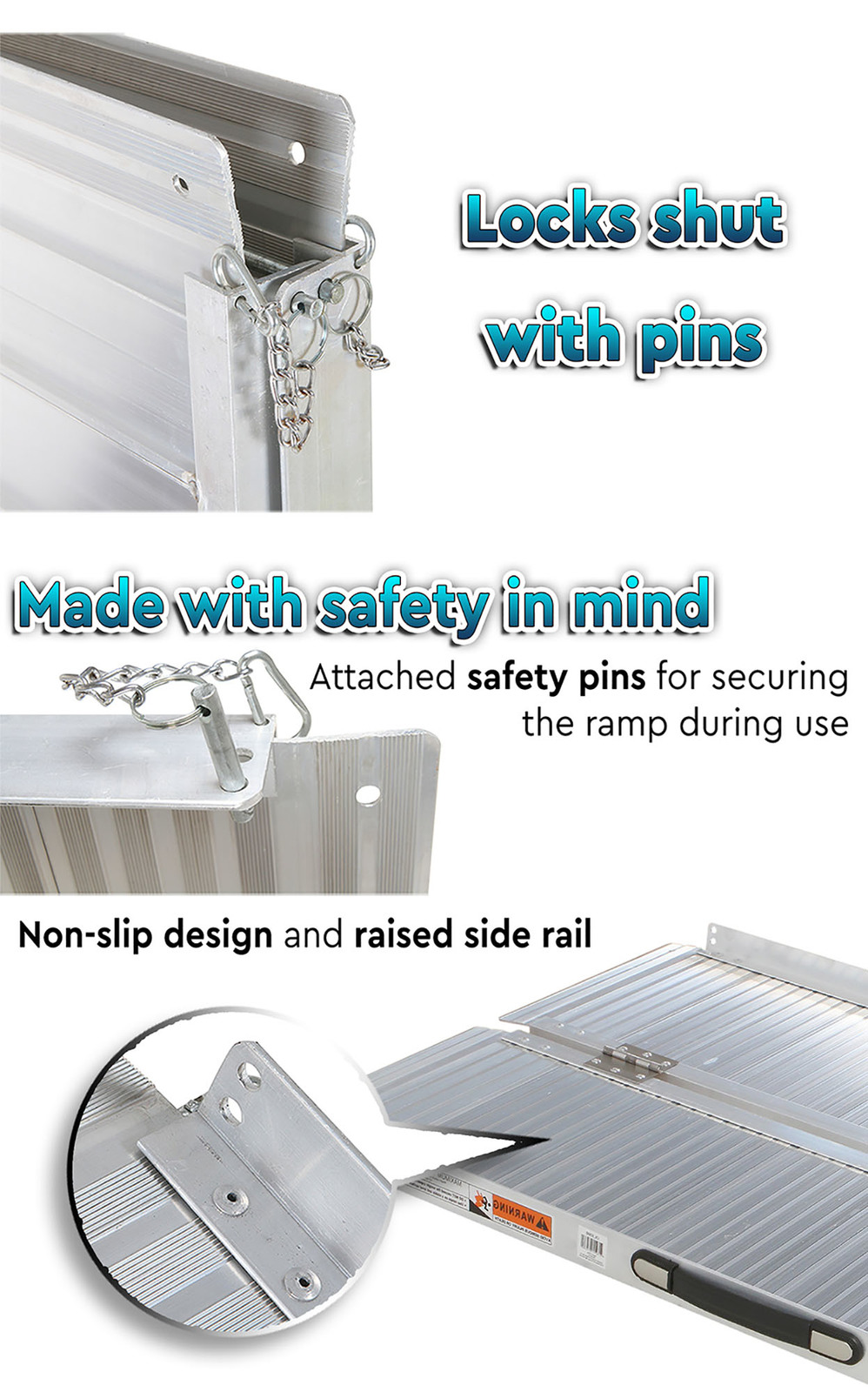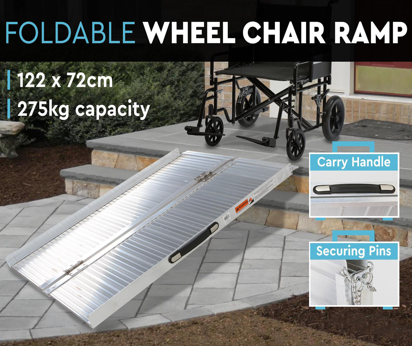 | Portable Wheelchair Ramps – Fit All Accessibility Needs Load your power wheelchair or scooter into a vehicle, or navigate steps, over a curb, or onto a porch with this lightweight, portable wheelchair ramp! These high-quality ramps are an affordable accessibility solution for almost all mobility vehicles, but they compromise nothing on strength, durability, and safety. The ramps are treated to be weather and corrosion resistant, making them ideal for daily use in either domestic or commercial setting. Designed to be lightweight with carrying handle so you can easily take it anywhere Safety features are included for your peace of mind. The non-slip surface and raised side rail have a lifetime guarantee, so it can be trusted to prevent accidents with both manual and electric vehicles. It also provides a reliable pathway and a safety pin attached for securing the ramp when in use If you have the need for a sturdy ramp that can be folded up when not in use then look no further! Get your Foldable Wheel Chair Ramp Now! FEATURES & SPECIFICATIONS Material: Aluminum Maximum Loading Capacity: 275KG Product Dimension: 122 x 72cm Non-Skid Safety Surface & Raised Side Rail Lightweight and Portable Folded into half with carry handle Suitable For Curbs, Van Floors, Steps & More Ideal For Indoor & Outdoor Use |