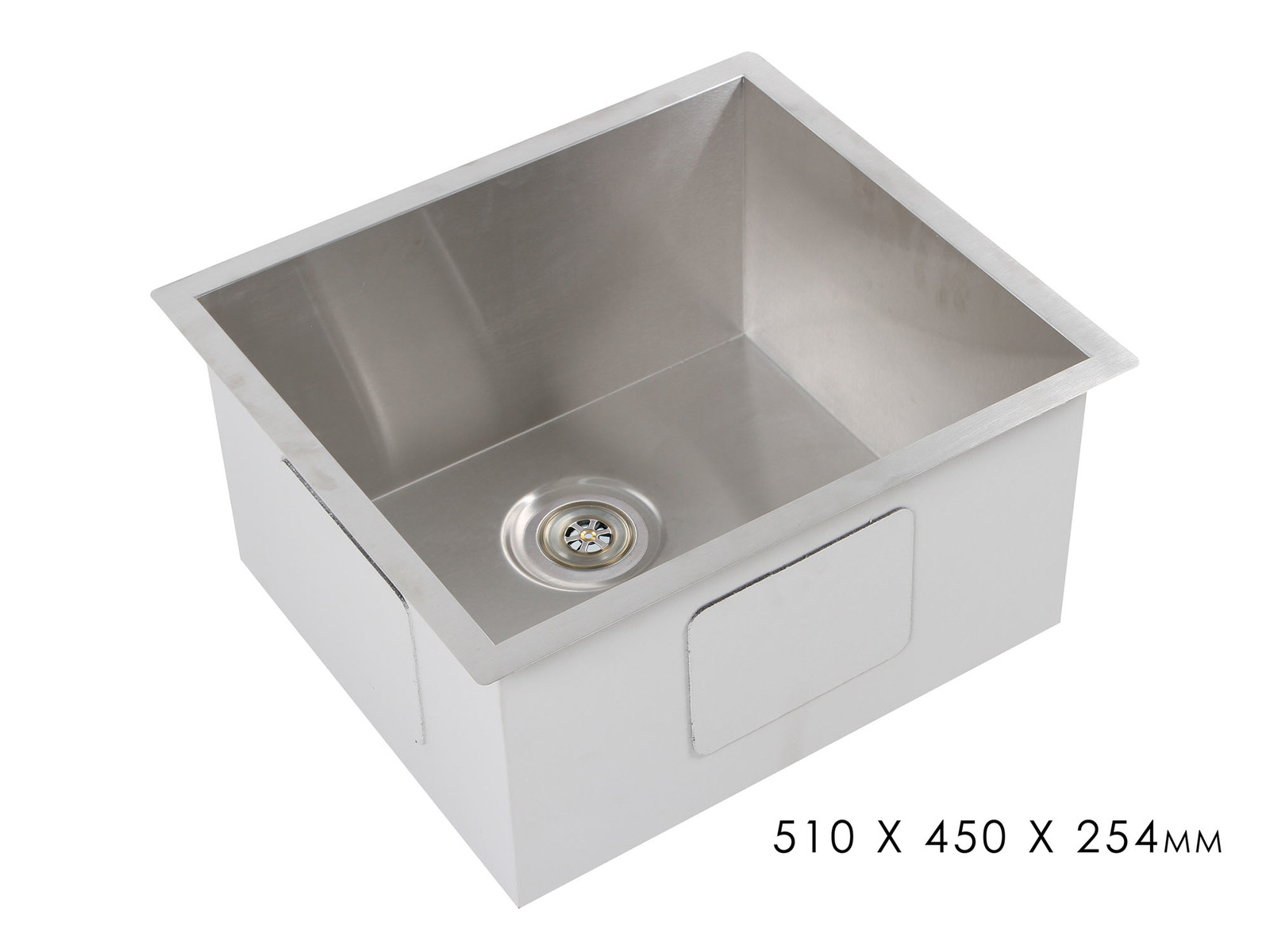 | Premium Handmade Stainless Steel Sink - 51x45cm The perfect product for your kitchen or laundry space! A simple, functional, inexpensive kitchen sink can be installed as a Self-rimming top mount, or mounted from below. It is made of premium grade T-304 stainless steel, non-toxic lead-free materials & ISO approved production processes. Scratch resistant premium satin finish and handcrafted with 18 gauge construction makes it reliable and durable kitchen accessory. This sink offers exactly what you would expect and more. Buy one of these today and enjoy the long-term durability! FEATURES AND SPECIFICATIONS: Handmade stainless steel sink Dimension: 51cm x 45cm Simple and modern design 304 stainless steel construction 18 Gauge High-grade brushed surface, easy to clean 5 or 8 sound deadening pads to reduce noise (single bowl or double bowl) Waste strainer included Perfect to fit in kitchen and laundry room Suitable for drop-in, under mount Clips and cut-out templates included |