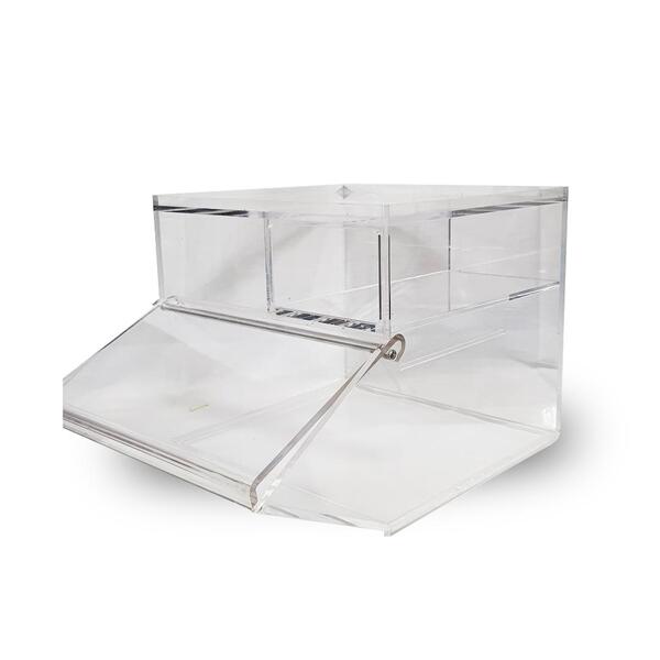 This large acrylic candy bin is a high-quality storage container that can greatly benefit a variety of stores. Designed in a transparent, clear colour, this Acrylic Candy Bin is a great way to attract customers as it displays the interior of the container. Through enhanced visibility, customers can easily view and access many dry goods like nuts, chocolates, lollies and many more. With a capacity of 15L, our Acrylic Candy Bin is best for storing dry bulk items like nuts and confectionery. Access to the wide variety of products is further enhanced through the sliding door instead of hinged doors which can be opened upwards in an easy slide motion. Not to mention the precise and detailed design of our acrylic containers which results in their stackable feature. A stackable design conserves counter top space whilst still providing customers with a variety of items.The container’s design also consists of a compartment allocated for placing items like straws or a scoop.