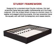 Designed for a standard-sized Double mattress, this bed ensemble frame features quality craftsmanship and the finest materials. With the brilliant sheen of easy-to-maintain black PU leather and elegant stitching accents, this bed ensemble frame fits equally well with both contemporary and classic decórs.