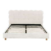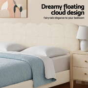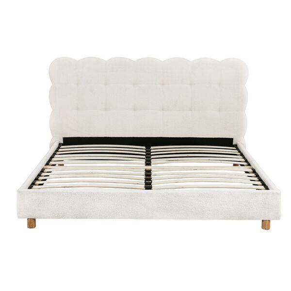cloud headboard bed frame in white. Features boucle fabric upholstery and durable wood and metal construction. This platform base fits queen mattresses. Includes wooden slats and metal legs for strength. Easy to assemble. Supports up to 300KG. Note: Actual colour may vary.