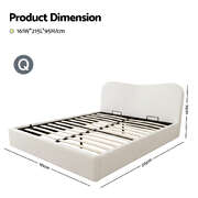 The Queen Bed Frame combines elegant boucle fabric upholstery with practical gaslift storage. Crafted from durable pine wood, this wooden platform bed features a padded headboard and reinforced plywood slats for mattress support. Smooth edges and metal connectors ensure safety and stability. Ideal for organising underbed space, this queen storage bed in beige white supports up to 300kg.