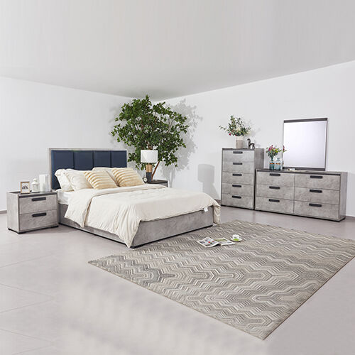 Our newly arrived 5 Piece Copper Bedroom Set offers the perfect balance of style and functionality. This set includes a platform bed, two bedside tables, a tallboy, and a dresser with a mirror, all designed with a sophisticated Black Oak and Cement colour combination. The headboard of the bed features an elegant linear pattern that complements the clean and minimalist look of the entire set.
