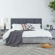 The platform bed is upholstered in high-quality fabric with foam quilting for comfort. The bedside tables, tallboy, and dresser are made of premium MDF board, known for its light weight and durability, providing a wooden finish at a fraction of the cost.
