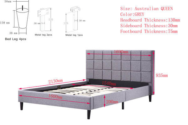 An exceptionally sturdy metal frame and support wooden slats provide a rock-solid foundation for your mattress that will surely lead to many restful nights. The Linen Fabric covering is similarly durable, not to mention easy to clean. The frame is designed to accommodate standard Queen-sized mattresses with dimensions of 153 x 203 cm (mattress and linens not included). The headboard is 108.5 cm tall (15cm leg & 93.5cm headboard) from top to bottom, and the overall dimensions of the bed frame are 169 cm x 213 cm.