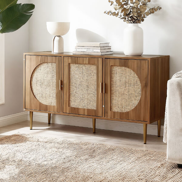 Looking to achieve a coastal bohemian look and feel in a functional furniture piece? Look no further than the Anya Buffet Sideboard. Featuring classic woven rattan doors on an MDF particleboard frame with solid glass shelves, the sideboard is built for long-lasting function. The smooth surface keeps the piece easy to clean and maintain simply wipe away spills with a damp cloth. The piece features a generous three-door cabinet with adjustable inner shelves to fit crockery, glassware, linens and more. The sleek metal handles allow you to open the magnetic doors and access the generous cupboard with ease. Metal legs with anti-slip foot pads keep the sideboard standing in place and protect your floors. Keep your glassware, crockery and other essentials neat and organized with the stylish and functional Anya Buffet Sideboard from .