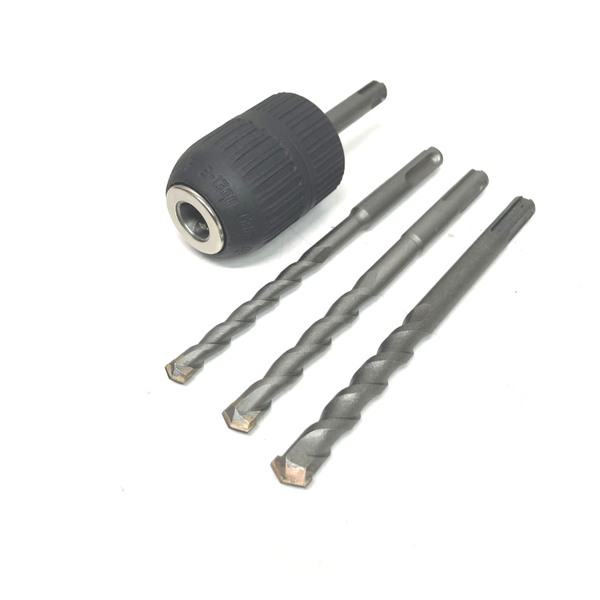 Carry case, 3 x SDS+ bits for brick / concrete, 13mm keyless chuck adaptor.