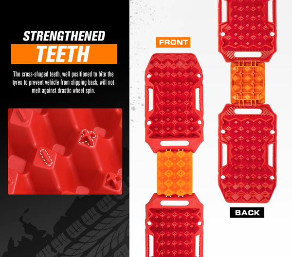Strengthened Teeth: The cross-shaped teeth, well positioned to bite the tyres to prevent vehicle from slipping back, will not melt against drastic wheel spin.