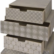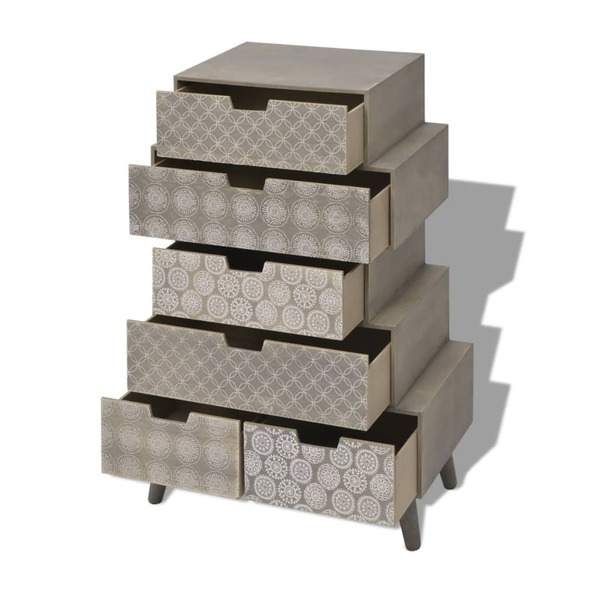 This side cabinet with 6 drawers has a retro design with elegant decorative patterns. The sideboard will make a practical as well as highly decorative addition to your bedroom, living area or lounge room. The rectangular top can be used to place a telephone or display decorative objects such as photo frames or potted plants. The six drawers provide ample space for keeping all kinds of smaller items organised and within reach. Thanks to the high-quality MDF material and the strong pinewood legs, this commode is very sturdy and durable. Assembly is really easy.