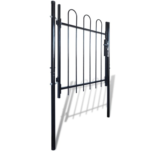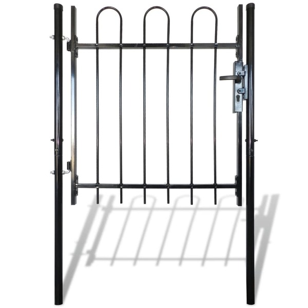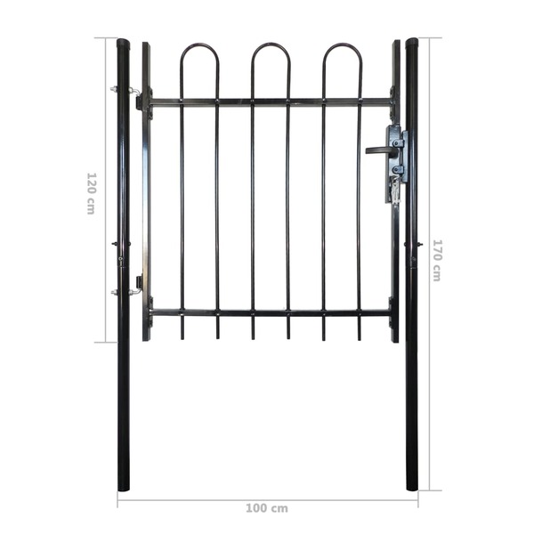 This garden gate will form a contemporarily styled, practical barrier, which will separate your garden from the outside world. Highly stable and durable, the fence gate provides a practical garden barrier for your garden, patio or terrace. With its elegant hoop top design and a strong horizontal brace to reinforce the frame, our garden gate will provide privacy and security, while forming a fabulous entry way to your property. Manufactured from heavy duty steel, the gate is powder-coated to protect against rust and corrosion. It also comes with a bolt hinge for quick locking, and mounting posts for easy installation. Three matching keys are also included in the delivery. This gate is a great combination of style, strength, stability and corrosion resistance!