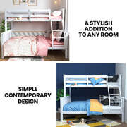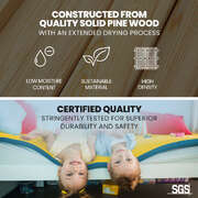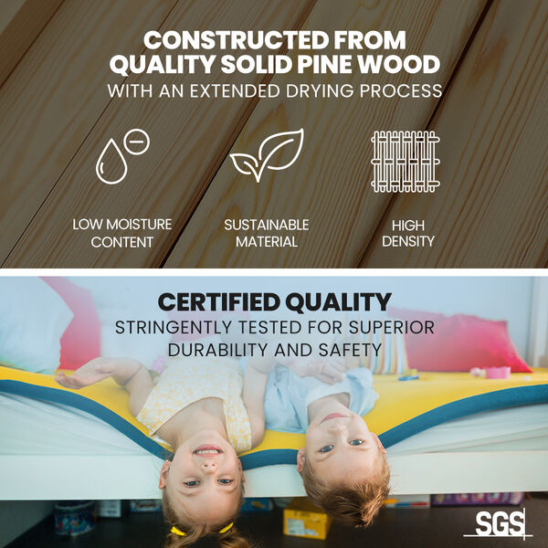 The Triple Bed Frame is crafted from solid high-quality sustainably sourced timber and is compatible with standard Australian single and double sized mattresses. Safety is paramount with SGS-certified quality, rously tested for superior durability. The bed features durable plywood slats and a solid, secure ladder. It even features an exclusive toy shelf which is sure to be a nice home for their favourites.