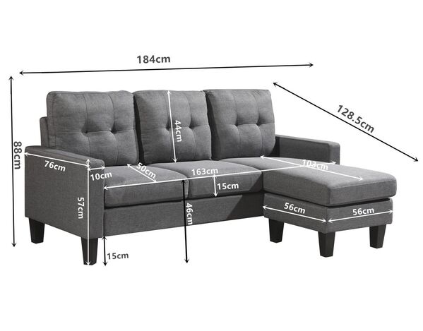 Product Dimensions: Size: 184*76/128.5x86.5cmH seater height 45cm, seater depth:50cm Backrest :41.5cm Armrest:10x56cm H seater inner:163cm chaise 102cm leg 15cm ,ottoman:55*55*45cm
