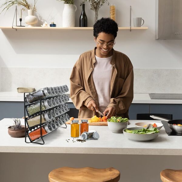 - SPACE-SAVING & STURDY DESIGN: The compact, space-saving design of the spice organiser is ideal for small kitchens or crowded cabinets. The angled tiered design makes it easy to access and view all your spices at a glance, ensuring an organized kitchen countertop or cabinet. Moreover, this spice rack organiser is crafted from high-quality, rust-resistant metal with a sleek black finish, this spice rack is built to last.