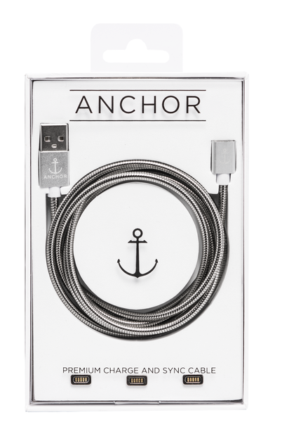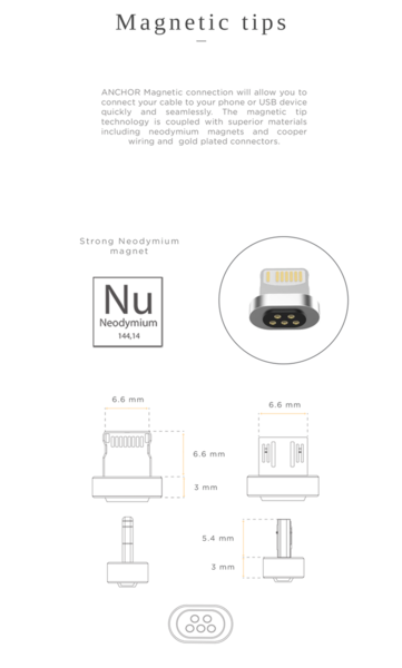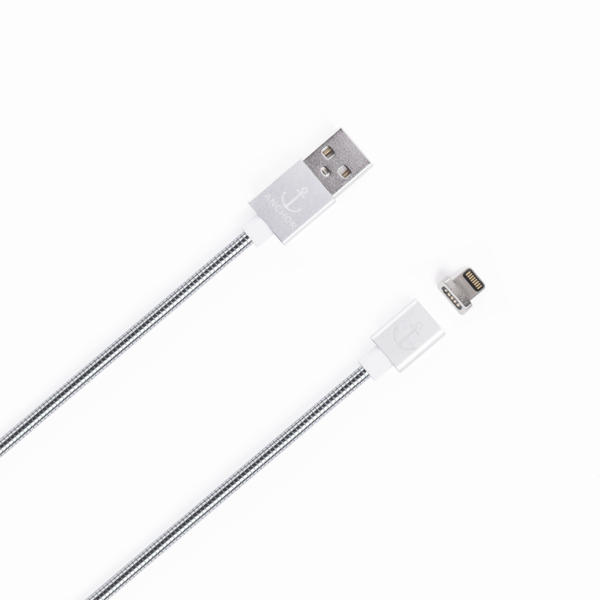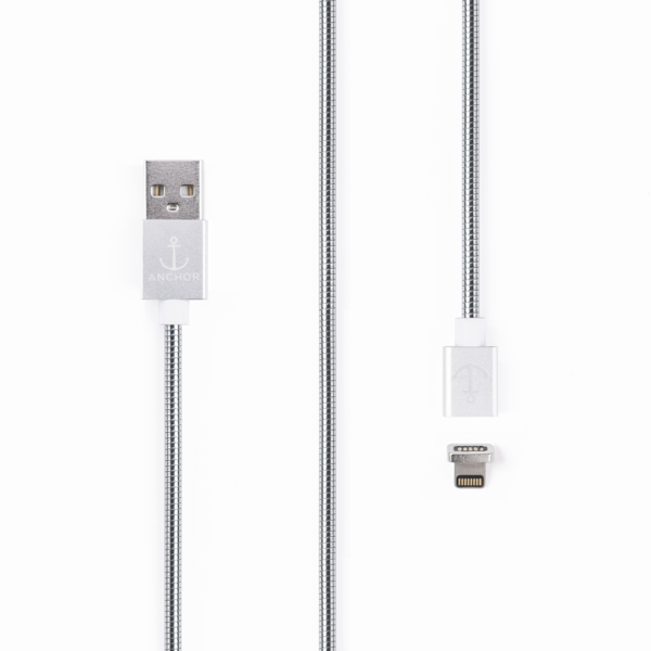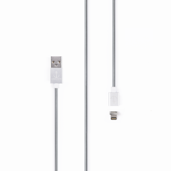 The cable is equipped with neodymium magnetic connectors - the same type of connection is used in a MacBook's MagSafe. The cable comes with all types of connectors, So no matter what device you are using, Anchor cable got you covered!