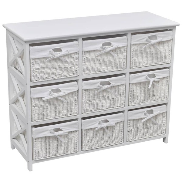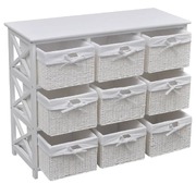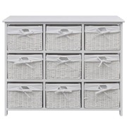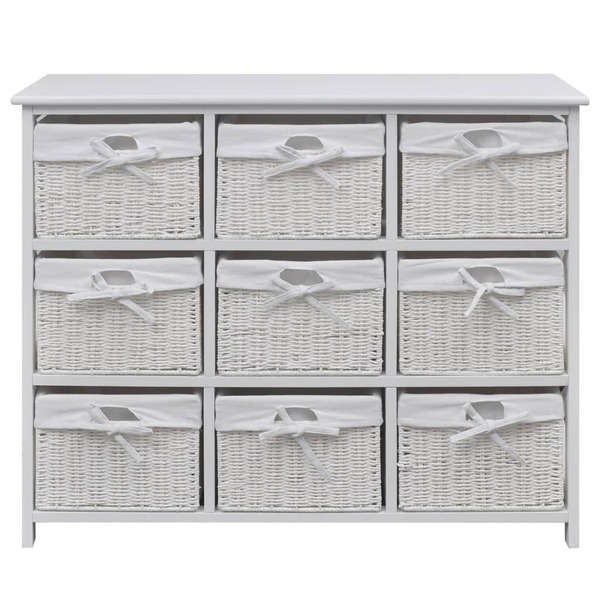 This stunning cabinet, made of high-quality material, features a simple but stylish design. It will not only keep your belongings neatly organised but will also enhance your room decor. This storage unit has 9 woven baskets, and each basket has a washable fabric liner. This piece of furniture has white paint finish that makes it durable and easy to clean. This beautiful, versatile cabinet presents a perfect storage solution for any room in your home.