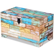 This vintage-style storage chest, made of solid reclaimed wood, will make a timeless addition to your home. It provides ample storage space for clothes, magazines, books, toys, tools and other accessories. It has a latch on the front and two handles on the side. With a stable top, this wooden box can also be used as a coffee table, couch table, living room table, side table, etc. The storage chest is made of recycled wood, which means every piece of furniture is unique and slightly different from the next. Furniture made of reclaimed wood has the characteristics of different woods, like teakwood, acacia, mango wood, saal wood, etc. Reclaimed wood is solid, stable, durable, and beautiful. Signs of wear and visible grain structure give each piece its own history and unique look. The storage chest is fully handmade, and the craftsmanship adds to its spectacular retro style. Every step of the process is carried out with the greatest care, be it recombining, polishing, painting or waxing. Important note: Colours vary from piece to piece, making each of our storage chests unique. The delivery is random, ensuring the exclusivity and individuality of your product.