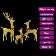 Check out this stunning Morden Reindeer Family holiday decoration! It perfectly captures that festive joy mixed with modern elegance. With clean lines and a straightforward look, it's just the right fit for your living room or sheltered outdoor spaces. You'll love how these charming reindeer add a bit of whimsy and warmth to any holiday setup. Picture them standing proud in your garden or lighting up your indoor Christmas scene, their LED lights creating a lovely glow that charms every guest. And those fancy red bows? They're a stylish addition that makes these reindeer stand out in your seasonal decor. Quality Fabric Build These reindeer are made from tough fabric that can take a beating through the seasons, perfect for sheltered spots. They feel great and keep their shape, creating a cozy vibe and making sure they look good no matter where you use them. Intricate LED Lights With energy-efficient LED lights, these figures are bright and eye-catching. They have eight flash modes to match any mood, from lively celebrations to chill winter scenes. Thoughtfully arranged, the lights create a mesmerizing effect that grabs attention and enhances your festive setup. User-Friendly USB Connection: Setting these up is a cinch thanks to the USB power source. You can place them anywhere without worrying about finding traditional power outlets. This flexible setup is perfect for modern spaces that need a stress-free decoration experience. Stylish Modern Design This reindeer family has a sleek look with clean lines and minimal decoration. They’re a great match for any decor style, striking a lovely balance between charm and sophistication, making them a delightful addition to your holiday arrangements. Seasonal Versatility Thanks to their weather-resistant features, these figures work well both indoors and outside in sheltered areas. Whether they’re by the fireplace or in a garden nook, they bring festive joy to any space. Their adaptability boosts the impact of your holiday decor across any home or venue.,