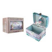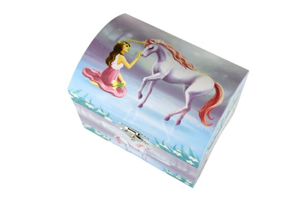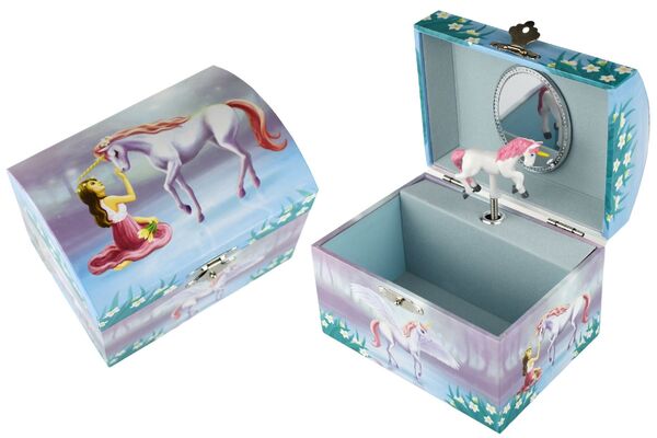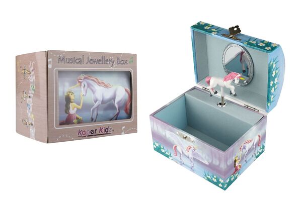 Children will love this magical musical jewellery box from Kaper Kidz. It is sure to put a smile on their faces when they open the lid as they watch the Unicorn twirl to the music playing within. Each jewellery box is covered in beautifully illustrated pictures of dancers, ballerinas and more so you can proudly display this jewellery box on any shelf or table. On the back of each box is a small handle that can be wound up to play the music hidden within the jewellery box. The music will only play once the lid is opened and the figurine will spin along to its tune. Each box has been flocked inside with soft velvet fabric, to keep precious things safe. Behind the spinning figurine, a mirror features to show off the figurine as it spins. This music box plays to the tune from the Nutcracker Waltz of the Flowers . Each musical Jewellery Box from Kaper Kidz is designed as a decorative object for sorting and displaying precious items.