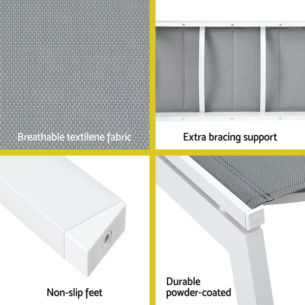 Make the most out of every sunny day with a Sun Lounger. Made from breathable textilene fabric on a strong powder-coated aluminium frame, the lounger is sturdy and resistant to weather and corrosion. Non-slip feet and extra bracing support keeps the chair upright and stable with a 150kg weight capacity. 5 adjustable backrest settings offer you the perfect position to rest and relax. Smooth wheels make the chair easy to move and chase the sun. Best of all, the lounger is easily assembled and can be used anywhere such as the beach, the park, poolside or even indoors. Have more fun in the sun with a Sun Lounger.