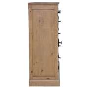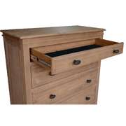 With its Rustic French Provincial Style, showcasing traditional construction, this tallboy adds refined beauty to the bedroom. It helps keep it neat and tidy. The tallboy has 5 spacious drawers. The drawers have full-extension metal runners, and the top drawer is lined with black felt to store delicate items. Black metal handles give a nice look to the drawers. It is made of solid pine wood, harvested in a sustainable way. The rustic finish is done by hand which means no two furniture pieces are the same in looks. The furniture features a natural pine colour that looks good amid a variety of interior decor styles. The fully assembled furniture comes with a 1-year warranty.