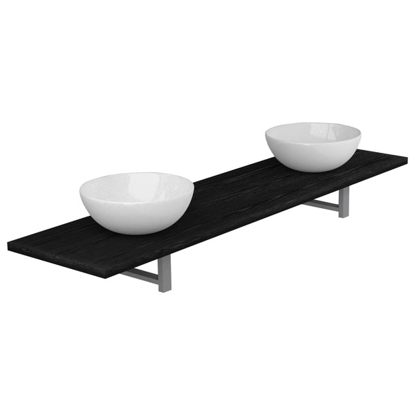 Our practical and timeless bathroom furniture set consists of a wall shelf and two round-shaped basins. It will make a stylish addition to any bathroom, washroom or powder room. Made of the strong material, the bathroom wall shelf is exceedingly stable and durable, making it the perfect place to place the included ceramic basins. This ceramic basins have a high gloss finish and are easy to clean with a damp cloth. In addition, the bathroom furniture can be easily installed on the wall with our included brackets and mounting materials. The perfect combination of the wall shelf and wash basin will be the focal point in your bathroom! Please note that no drain is included in delivery.