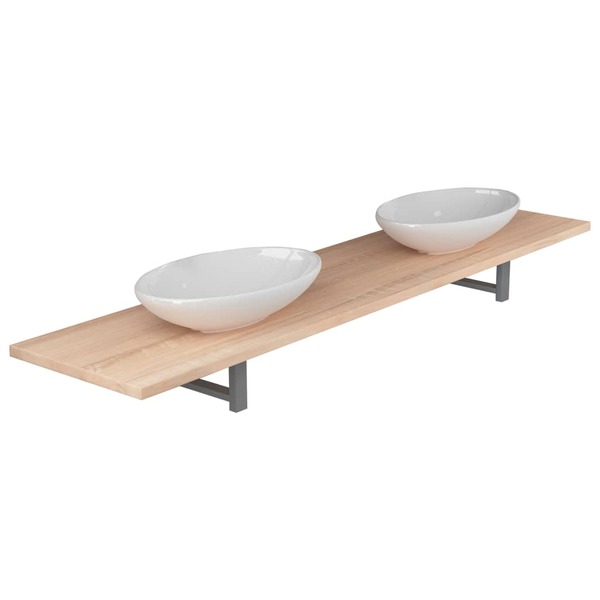 Our practical and timeless bathroom furniture set consists of a wall shelf and two oval-shaped basins. It will make a stylish addition to any bathroom, washroom or powder room. Made of the strong material, the bathroom wall shelf is exceedingly stable and durable, making it the perfect place to place the included ceramic basins. This ceramic basins have a high gloss finish and are easy to clean with a damp cloth. In addition, the bathroom furniture can be easily installed on the wall with our included brackets and mounting materials. The perfect combination of the wall shelf and wash basin will be the focal point in your bathroom! Please note that no drain is included in delivery.