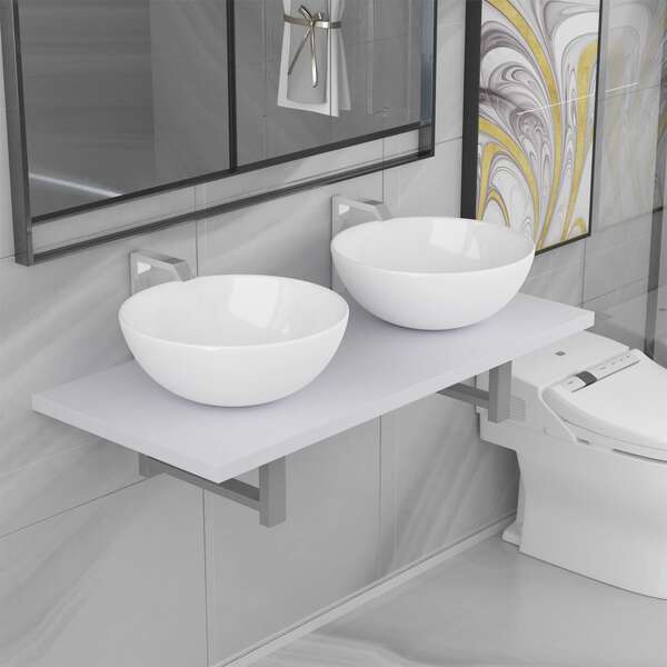 Our practical and timeless bathroom furniture set consists of a wall shelf and two round-shaped basins. It will make a stylish addition to any bathroom, washroom or powder room. Made of the strong material, the bathroom wall shelf is exceedingly stable and durable, making it the perfect place to place the included ceramic basins. This ceramic basins have a high gloss finish and are easy to clean with a damp cloth. In addition, the bathroom furniture can be easily installed on the wall with our included brackets and mounting materials. The perfect combination of the wall shelf and wash basin will be the focal point in your bathroom! Please note that no drain is included in delivery.