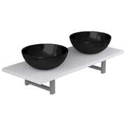 Our practical and timeless bathroom furniture set consists of a wall shelf and two round-shaped basins. It will make a stylish addition to any bathroom, washroom or powder room. Made of the strong material, the bathroom wall shelf is exceedingly stable and durable, making it the perfect place to place the included ceramic basins. This ceramic basins have a high gloss finish and are easy to clean with a damp cloth. In addition, the bathroom furniture can be easily installed on the wall with our included brackets and mounting materials. The perfect combination of the wall shelf and wash basin will be the focal point in your bathroom! Please note that no drain is included in delivery.