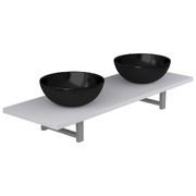 Our practical and timeless bathroom furniture set consists of a wall shelf and two round-shaped basins. It will make a stylish addition to any bathroom, washroom or powder room. Made of the strong material, the bathroom wall shelf is exceedingly stable and durable, making it the perfect place to place the included ceramic basins. This ceramic basins have a high gloss finish and are easy to clean with a damp cloth. In addition, the bathroom furniture can be easily installed on the wall with our included brackets and mounting materials. The perfect combination of the wall shelf and wash basin will be the focal point in your bathroom! Please note that no drain is included in delivery.