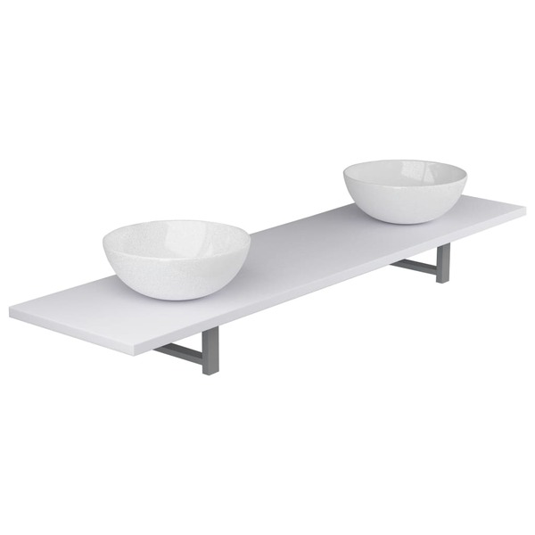 Our practical and timeless bathroom furniture set consists of a wall shelf and two round-shaped basins. It will make a stylish addition to any bathroom, washroom or powder room. Made of the strong material, the bathroom wall shelf is exceedingly stable and durable, making it the perfect place to place the included ceramic basins. This ceramic basins have a high gloss finish and are easy to clean with a damp cloth. In addition, the bathroom furniture can be easily installed on the wall with our included brackets and mounting materials. The perfect combination of the wall shelf and wash basin will be the focal point in your bathroom! Please note that no drain is included in delivery.