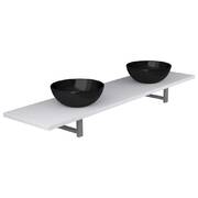 Our practical and timeless bathroom furniture set consists of a wall shelf and two round-shaped basins. It will make a stylish addition to any bathroom, washroom or powder room. Made of the strong material, the bathroom wall shelf is exceedingly stable and durable, making it the perfect place to place the included ceramic basins. This ceramic basins have a high gloss finish and are easy to clean with a damp cloth. In addition, the bathroom furniture can be easily installed on the wall with our included brackets and mounting materials. The perfect combination of the wall shelf and wash basin will be the focal point in your bathroom! Please note that no drain is included in delivery.