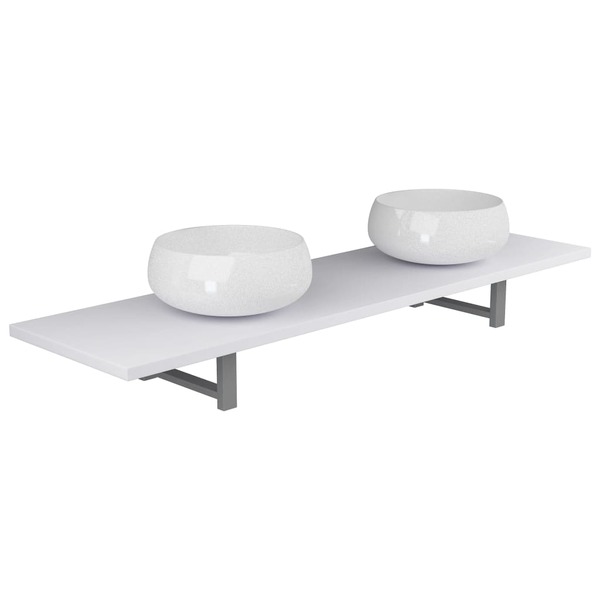 Our practical and timeless bathroom furniture set consists of a wall shelf and two round-shaped basins. It will make a stylish addition to any bathroom, washroom or powder room. Made of the strong material, the bathroom wall shelf is exceedingly stable and durable, making it the perfect place to place the included ceramic basins. This ceramic basins have a high gloss finish and are easy to clean with a damp cloth. In addition, the bathroom furniture can be easily installed on the wall with our included brackets and mounting materials. The perfect combination of the wall shelf and wash basin will be the focal point in your bathroom! Please note that no drain is included in delivery.