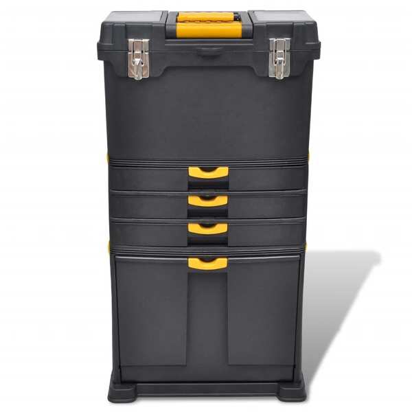 This high-quality tool case, equipped with 2 castors and a handle, is a perfect choice to protect your tools and equipment during transport or for better storage. Featuring a top case, a bottom case and a middle section with 3 drawers, this robust tool case offers you large storage space and will surely help you to maintain your tools in great order and thus bring convenience of future use. Both the top case and the bottom case are spacious enough to accommodate large tools, while all the middle 3 drawers have compartments inside for you to better classify small-sized tools, like screws and nuts. Thanks to the side locks, you could easily separate the tool case when you only want to take the top case.Made of quality polypropylene, the tool case has high thermal stability, corrosion resistance and is very durable for years of use. Thanks to the telescopic handle, the tool case is portable. It is surely a great helper to organize your tools.