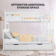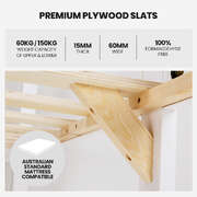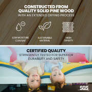 The Triple Bunk Bed Frame is crafted from solid high-quality sustainably sourced timber and is compatible with standard Australian single and double sized mattresses. Safety is paramount with SGS-certified quality, rously tested for superior durability. The bed features durable plywood slats and a solid, secure ladder. It even features an exclusive toy shelf which is sure to be a nice home for their favourites.